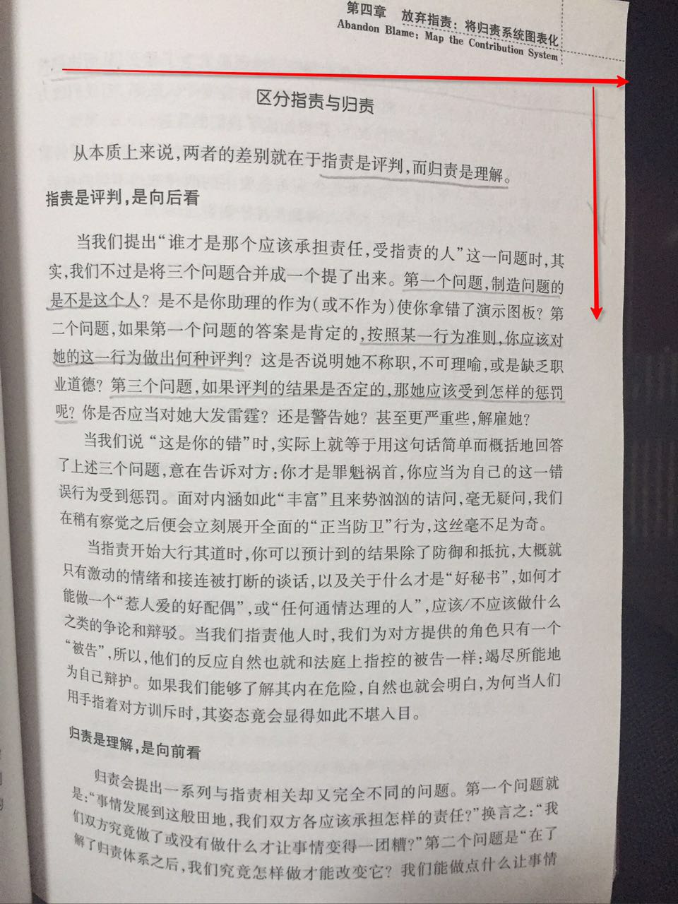 这个片段是关于指责和归责的。请大家想象一下,如果你的领导交给你一项任务,你很想好好表现,但团队里的某个成员在他负责的环节上出了点问题,导致任务没有完成,或者结果比你预期的差好多。这个时候,你是不是很郁闷,然后呢,脑子里会不会有这样一句话跳出来:“该死的,这个人怎么这样,都怪他才会这样!!”就像拆页里所说的,这是妥妥的指责哦。那么归责的姿势又是怎样的?“这件事情到了现在的地步,我们双方有些什么责任。