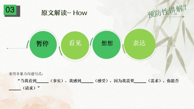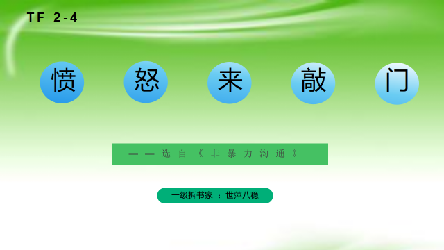 通过今天的学习,我相信大家能复述出表达愤怒和化解愤怒的四步骤并能够运用四步骤进行反思或演练。选自《非暴力沟通》