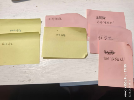 好,我们现在集中讨论票选出的这个问题: 为何定保险丝这环节为什么不容易做?请各组继续用3分钟讨论,把最深层的2-3个原因列出来,请组长带领大家讨论并记录在便签纸上。3分钟后请每位小组派代表分享2-3条内容,大家先不必讨论解决方案。