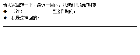 现在,请大家设想一下——如果时光可以倒流,让你穿越回去重新面对当时的质疑,运用刚刚学到的新的方法,你会怎么回答呢?请把它写到“穿越之旅”下面的横线上,按照“先认同→再解释→说办法”三个步骤写出你的回答。”写好以后给自己的小组成员分享。时间3分钟。