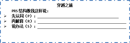 【where】所以,这个方法,最适合应用的场景是:应对突发、带有情绪的质疑,(如老板问责、客户投诉、亲密关系的抱怨),当然,前提是对方“对事不对人”,是冲着解决问题来的;如果对方已被强烈的负面情绪主导,则应优先考虑处理情绪,待气氛缓和了,再运用PRS结构来商议具体解决方案。如果是恶意挑衅或故意人身攻击,则这个方法是不适合的。