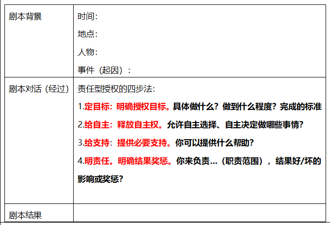 在未来的一周或者一个月内,你可能会用到责任型授权的场景。剧本要有人物,时间,地点;情节发展要有起因,经过和结果;设想当时双方的对话。其中,对话要体现责任型授权的四步法。