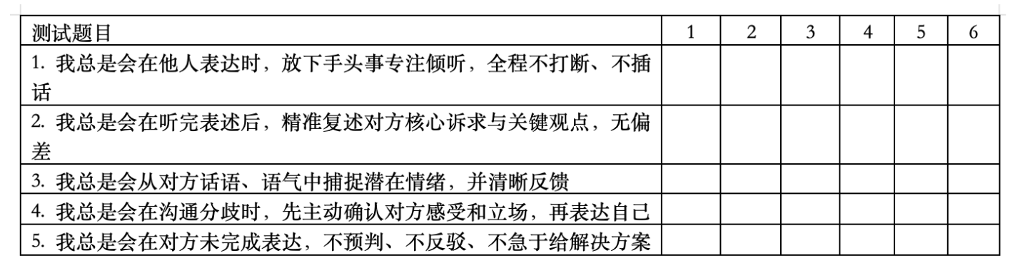 测试说明:在此也说明一下,这个量表仅作为初步了解大家当下移情聆听水平的小测试,非权威测评。仅供大家了解自己的当前状态,不要因此给自己贴标签甚至自我否定。