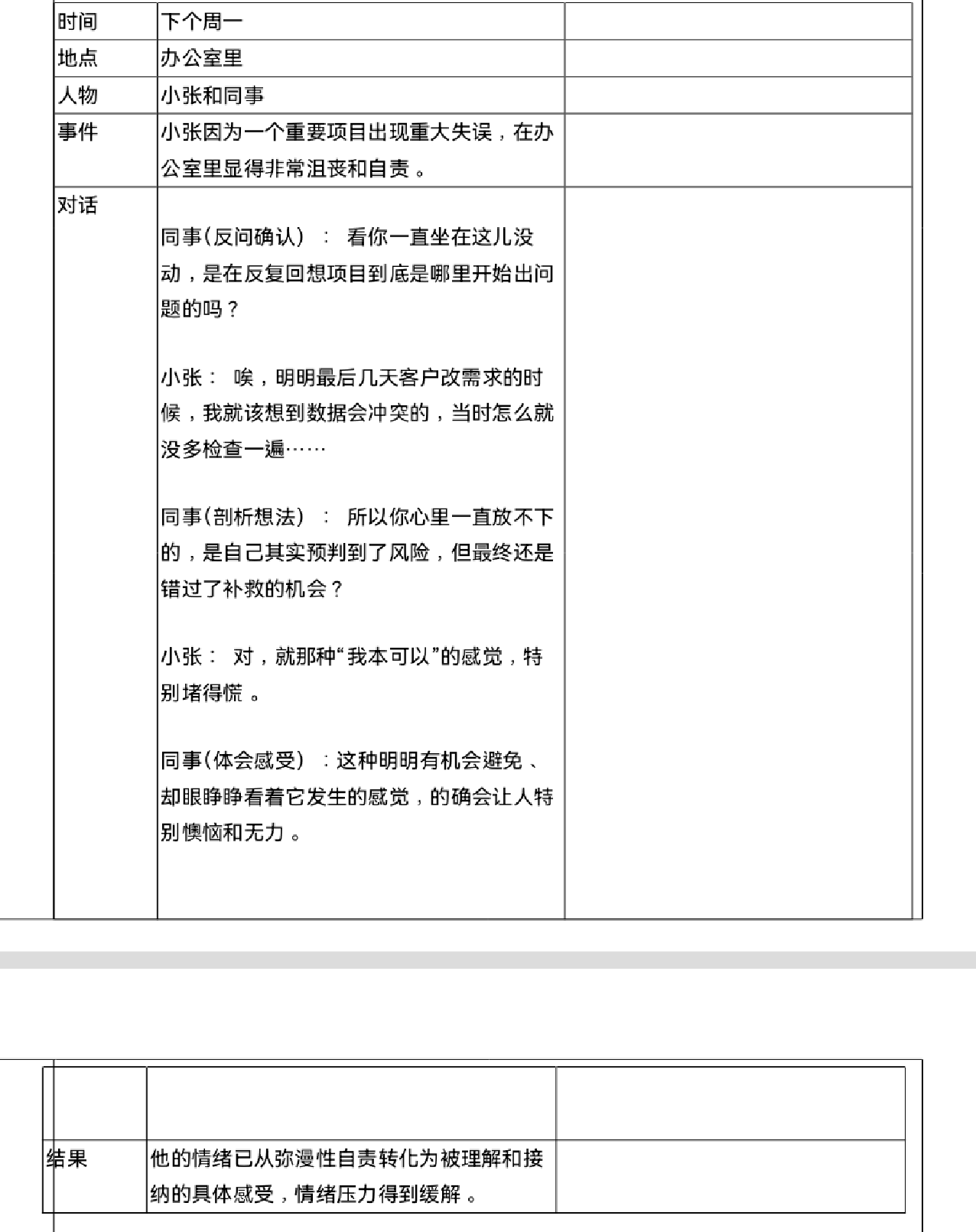 拆书家:为了帮助大家更好的理解“移情聆听”和“同情”,我们来看一个具体的例子:小张因为一个重要项目出现重大失误,在办公室里显得非常沮丧和自责。