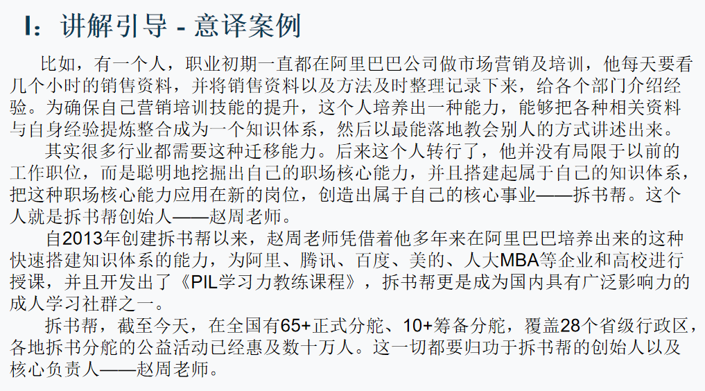 自2013年创建拆书帮以来,赵周老师凭借着他多年来在阿里巴巴培养出来的这种快速搭建知识体系的能力,为阿里、腾讯、百度、美的、人大MBA等企业和高校进行授课,并且开发出了《PIL学习力教练课程》,拆书帮更是成为国内具有广泛影响力的成人学习社群之一。