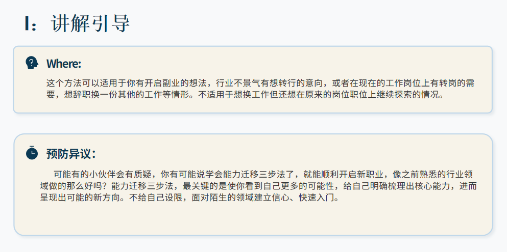 【总结回顾】 到此为止,我们就完成了今天两个片段的拆解。让我们快速回顾一下今天的核心: 今天我们拆了两套核心工具:第一,能力迁移三步法,帮你打破职位惯性、列出职业能力、找到新方向;第二,分析信息四问,帮你把新岗位新行业所需的核心能力筛选出来,顺利开始第一步。希望大家从今天开始,用这两套方法,勇敢迈出第一步,开启自己的人生第二曲线。