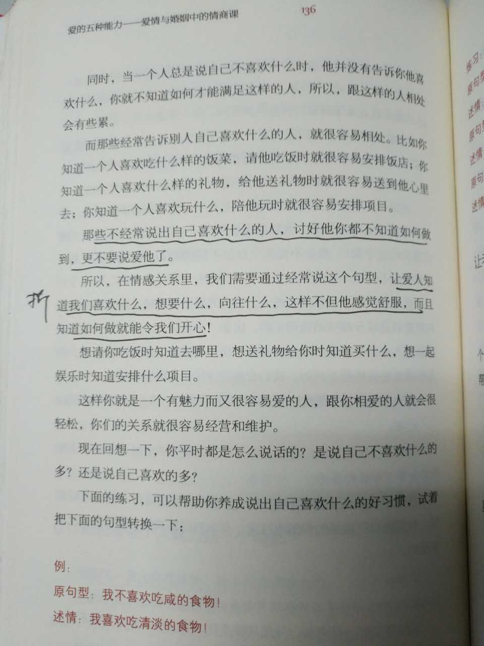 通过吃饭时只指出自己不喜欢吃的菜的案例,引出只说自己不喜欢什么,很难让他人理解。如果指出自己喜欢什么,不仅有利于他人理解自己的意思,同时更容易相处。