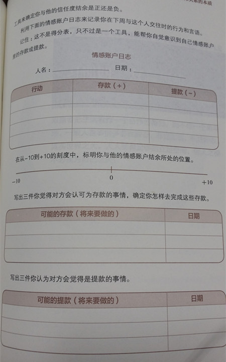 这个练习非常简单,第一步记录下你的行为,然后定义它是存款还是提款,分别的数字是多少,最后用刻度表的形式,评估你们情感账户的结余。