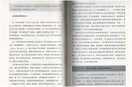 这一片段告诉我们给“未来的回报”打折是人的天性,但每个人打的折有所不同。有的人能够抵抗住“即时满足感”,牢记心里更大的奖励,对未来的回报打的折很低。但是也有人不能抵抗 “即时满足感”,及时享乐,就像清仓大甩卖一样对未来的回报打的折很高。其实你打折的多与少,决定了你未来能否成功,也决定了你长期的一个健康状态。但是在面临诱惑时,我们应该怎么办呢,请你想象一下,你这个选择就意味着,为了即时的满足感放弃了更好的长期奖励;再想象你已经得到了长期的奖励;再想象未来的你正在享受抵抗住诱惑的成果;最后,扪心自问:你愿意放弃它,来换取正在诱惑你的短暂快感吗?